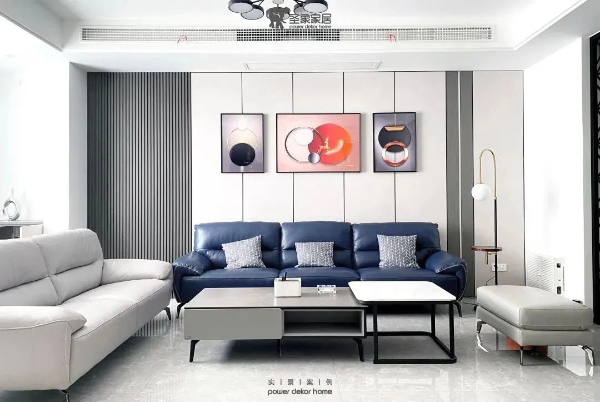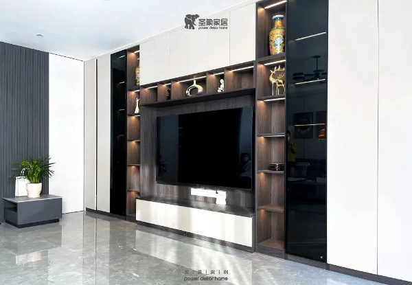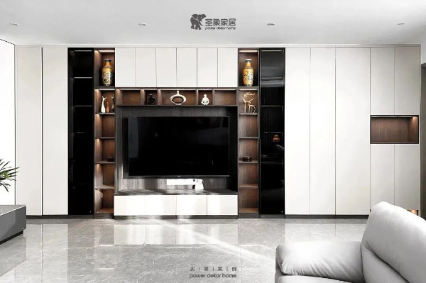 客廳電視柜采用鋅灰為柜體板,門板為米夏灰,搭配黑玻門板,置頂柜體拉伸空間感,整體空間高端開闊,空間收納展示功能性強。