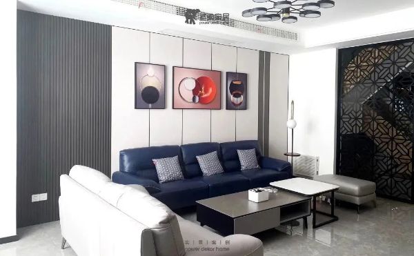 沙發背景墻與電視柜呼應,采用米夏灰墻板,同時搭配仿古木格柵,凸顯客廳的高格調。