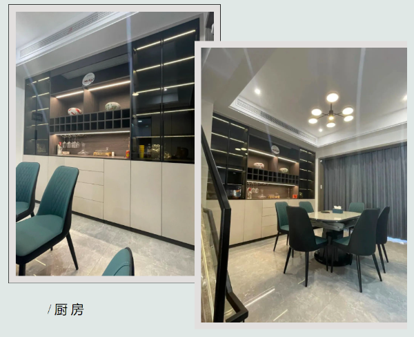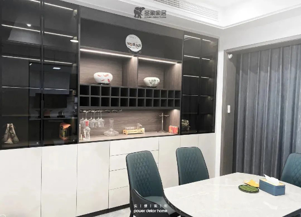 餐廳空間餐邊柜采用鋅灰做柜體板,米夏灰為門板。柜體對稱式結構,酒具物品收納擺放一應俱全。