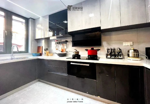 廚房空間采用「圣象家居全屋定制琥珀系列」,最佳的U型地柜結構,空間布局合理。地柜門板為N19深鐵巖,吊柜門板為N14淺鐵巖,均為PET新型材質高環保,油污極易清潔。
