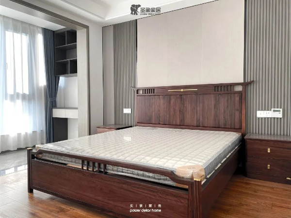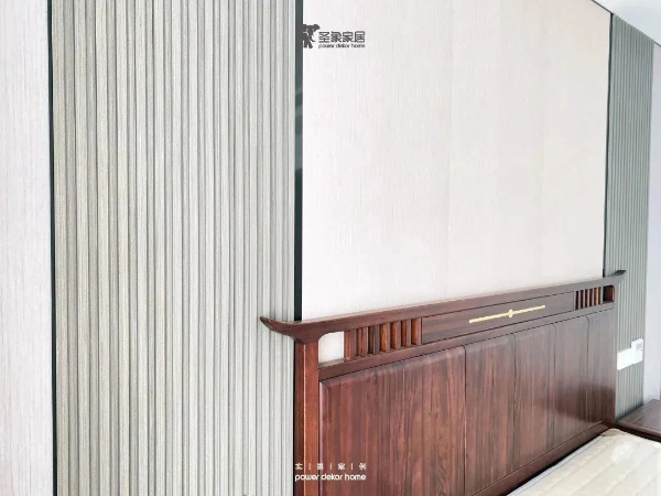 主臥空間簡潔舒適,床頭背景墻對稱式結構,格柵與護墻板的組合,延伸空間感。主臥陽臺設計小型書柜,可做辦公桌使用,提升空間功能。