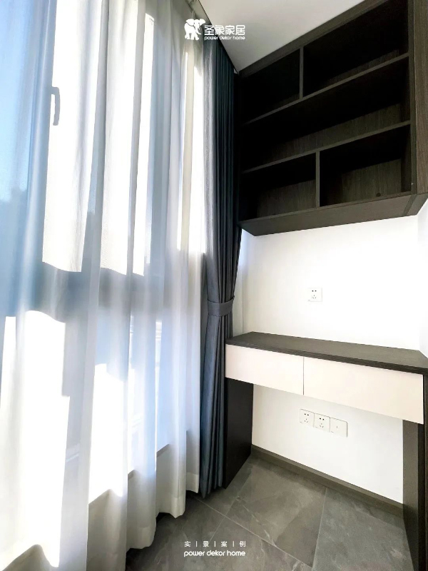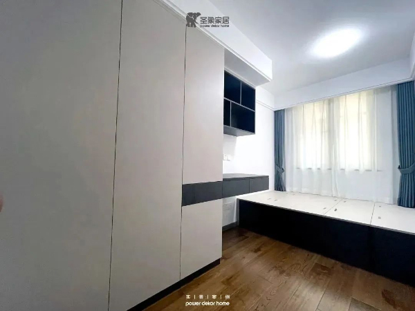 榻榻米依窗而建,底部收納性強。置頂衣柜延伸設計辦公桌,頂部開放式層板可擺放書籍文件。
