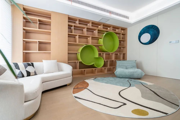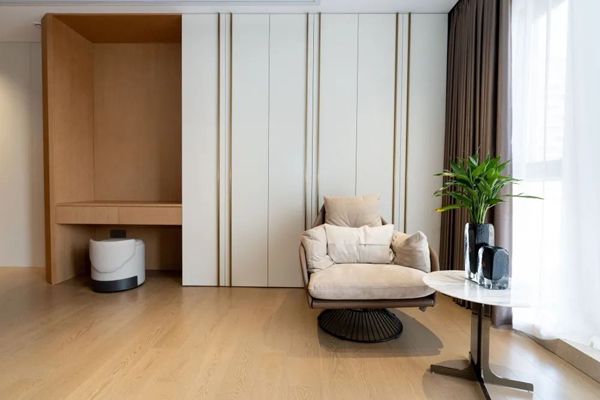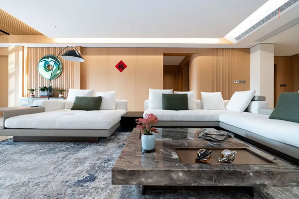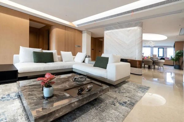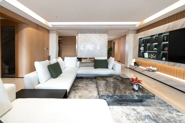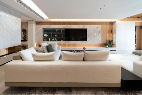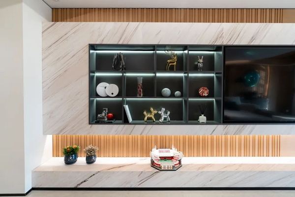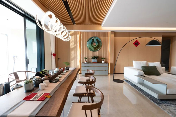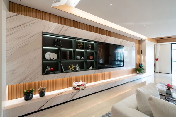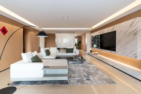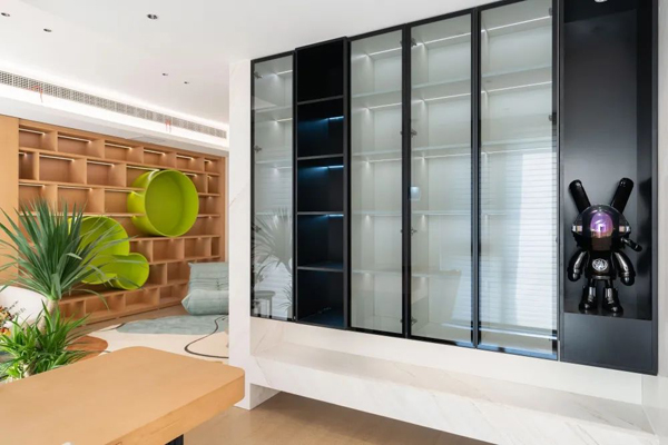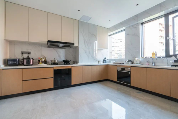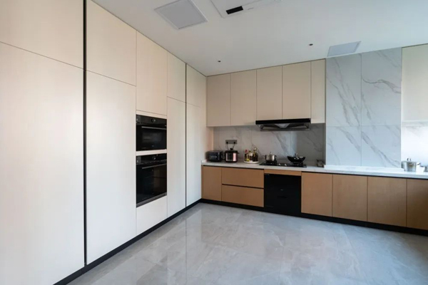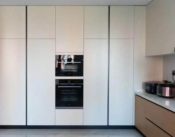 通頂櫥柜設計,奶白色渾水烤漆柜門與通高到頂的黑色拉手凸顯空間的大氣,嵌入式蒸烤箱和冰箱,讓櫥房空間整體感強。科技木地柜設計,與全屋方案設計高度統一。