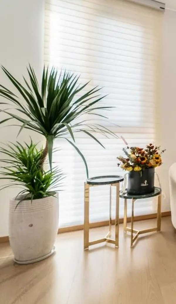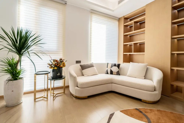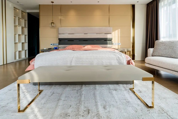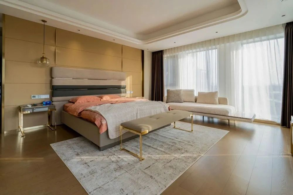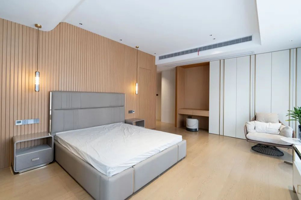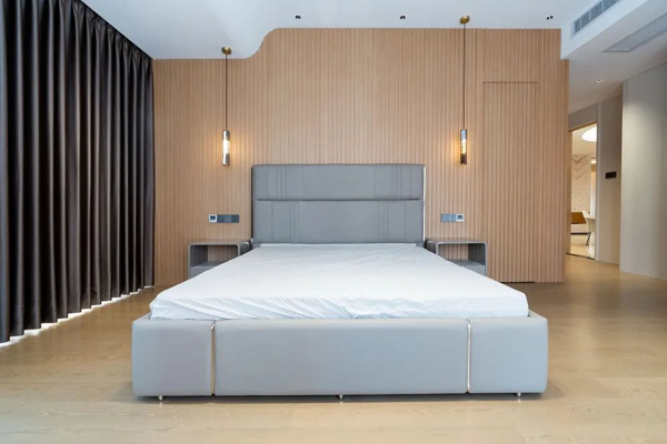 次臥入口即是回廊玄關,與定制衣柜延伸的收納空間;床頭背景墻采用科技木格柵造型,與衛生間隱藏門無縫銜接,空間舒適開闊。