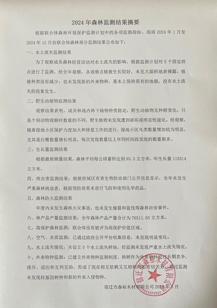 根據聯合體森林環境保護監測計劃中的各項監測指標,現將2024年1月至2024年12月份聯合體森林部分監測結果公布如下: