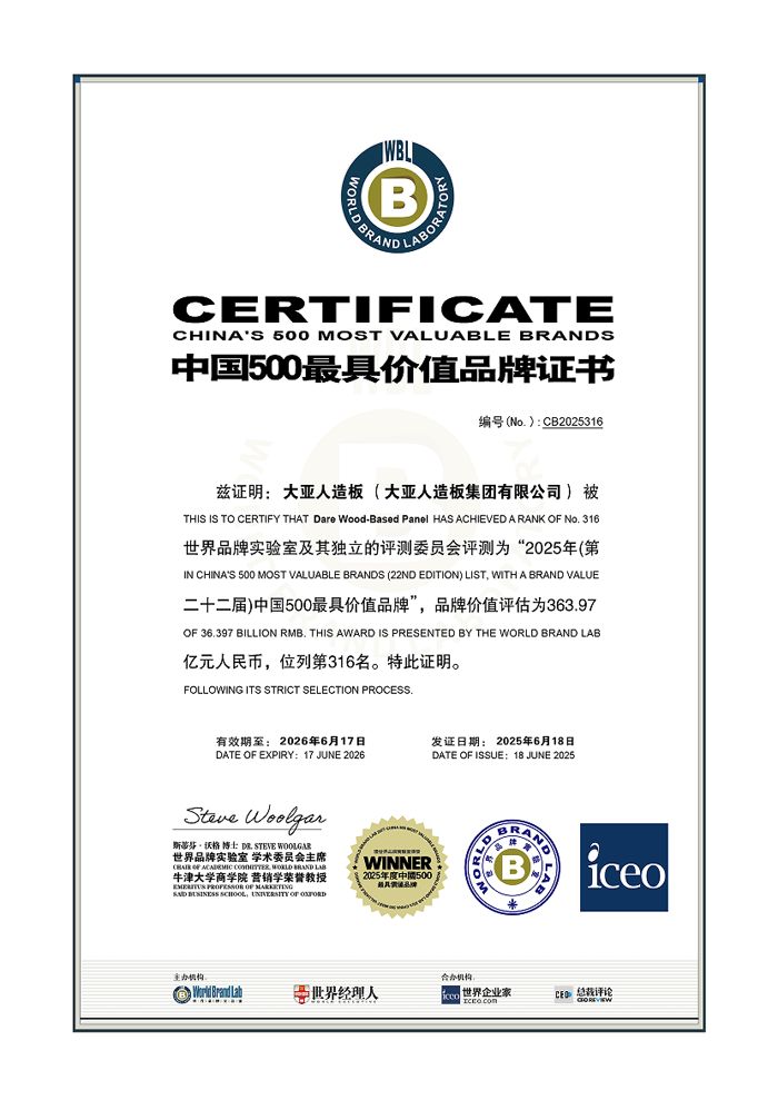 大亞人造板以363.97億元品牌價值蟬聯中國500最具價值品牌排行榜,價值增幅11.7%!品牌排名316位,第八次榮登最具價值品牌(人造板行業)榜首。